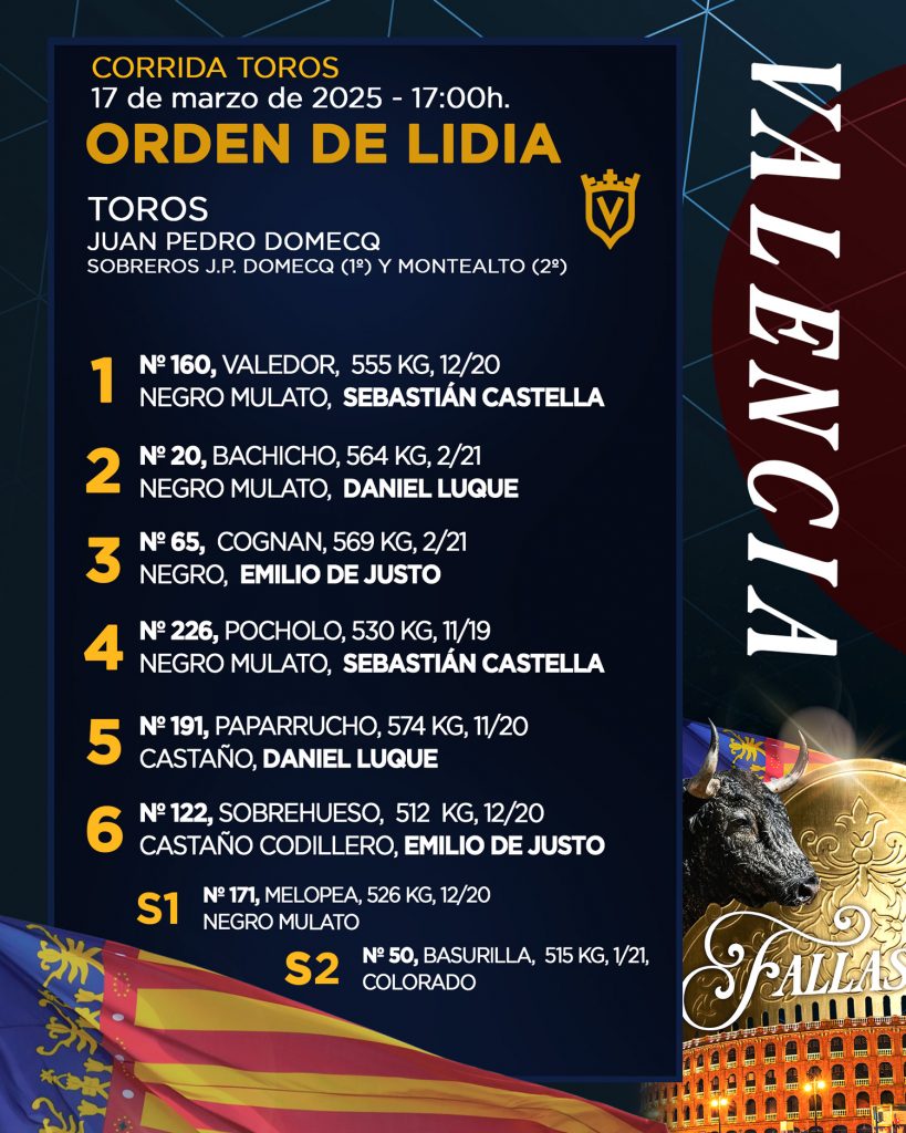 Seis toros de Juan Pedro Domecq aguardan ya en los chiqueros de la Plaza de Toros de Valencia para una nueva cita del abono de Fallas. A las 17h. los lidiarán Sebastián Castella, Daniel Luque y Emilio de Justo