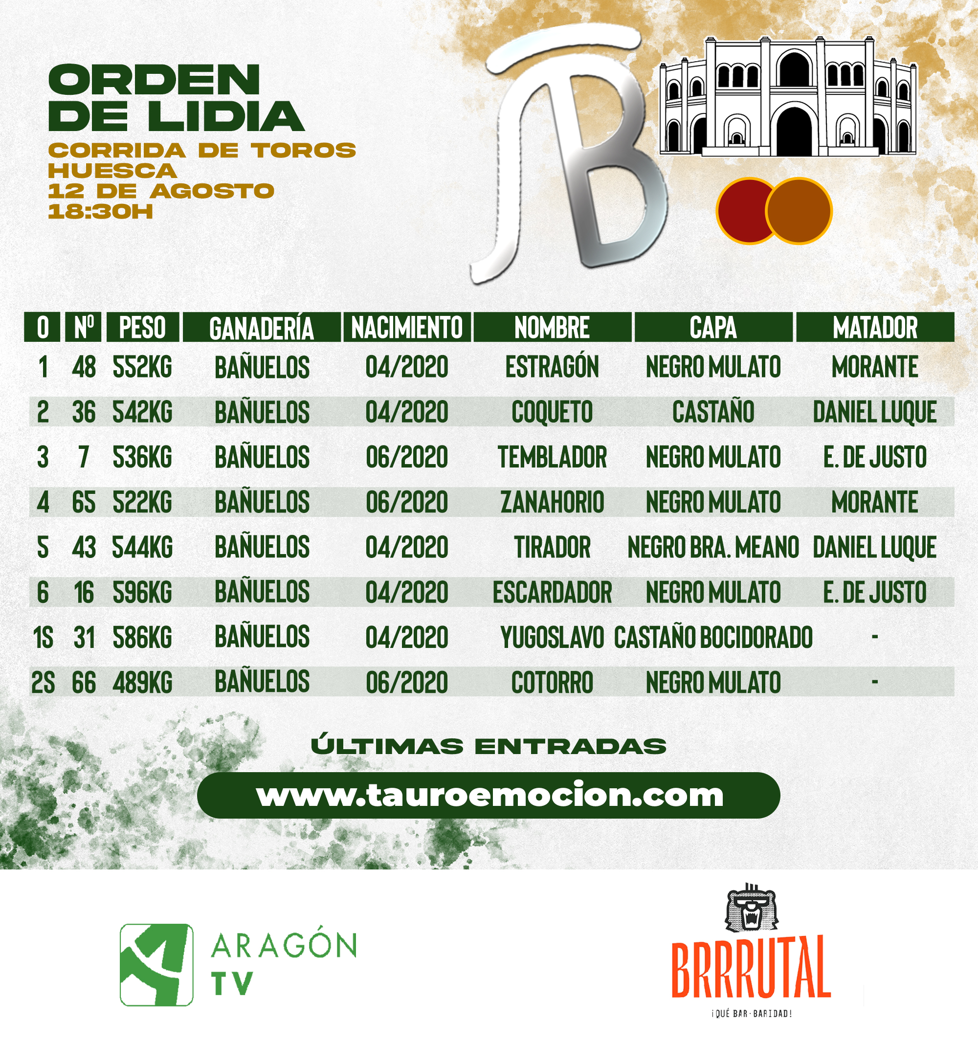 Los toros de Antonio Bañuelos, que serán lidiados esta tarde en la plaza de toros de Huesca, en la tercera de la Feria de La Albahaca 2024, ya han sido sorteados.