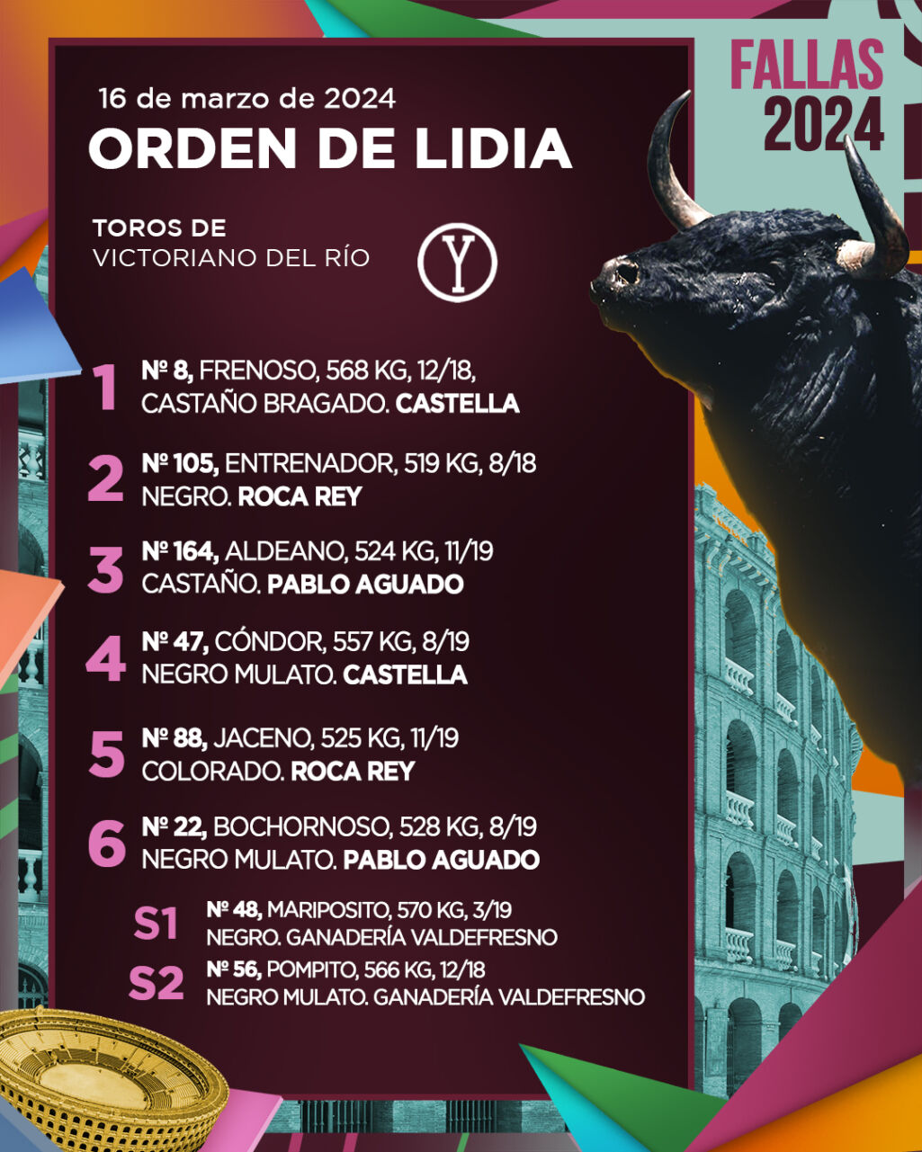 La plaza de toros de Valencia acoge esta tarde la primera de las dos comparecencias de Roca Rey en el ciclo fallero. Junto a Sebastián Castella y Pablo Aguado, se anuncian toros de Victoriano del Río que ya han sido sorteados.