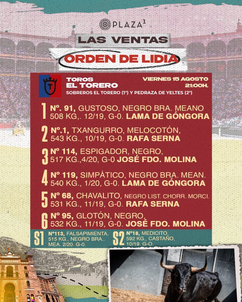 Sorteados y enchiquerados seis toros del hierro de Toros de El Torero para la corrida de toros que se va a celebrar esta noche en Plaza de Toros de Las Ventas con motivo de la festividad de la Virgen de la Paloma. A las 21h. harán el paseíllo Lama de Góngora, que confirma alternativa, Rafa Serna y José Fernando Molina.