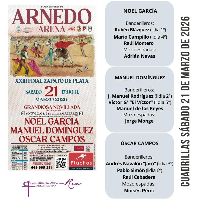Este sábado se celebrará en la plaza de toros de Arnedo la final del XXIII Zapato de Plata, una de las citas más destacadas para los novilleros sin picadores. Para la ocasión, se lidiarán erales de Galbarín, que ya han sido sorteados.