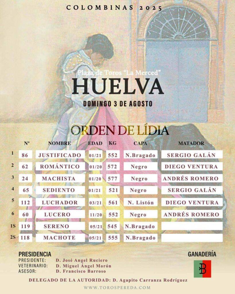 Los toros de Fermín Bohórquez para la gran corrida de rejones ya han sido enlotados, sorteados y enchiquerados a expensas de ser lidiados esta tarde en el sexto festejo -último- de la Feria Taurina de Las Colombinas 2025. Un cartel de máximo lujo en el Coso de la Vega Larga que está formado por Sergio Galán, Diego Ventura Andrés Romero. El festejo comenzará a las 20:00 horas.