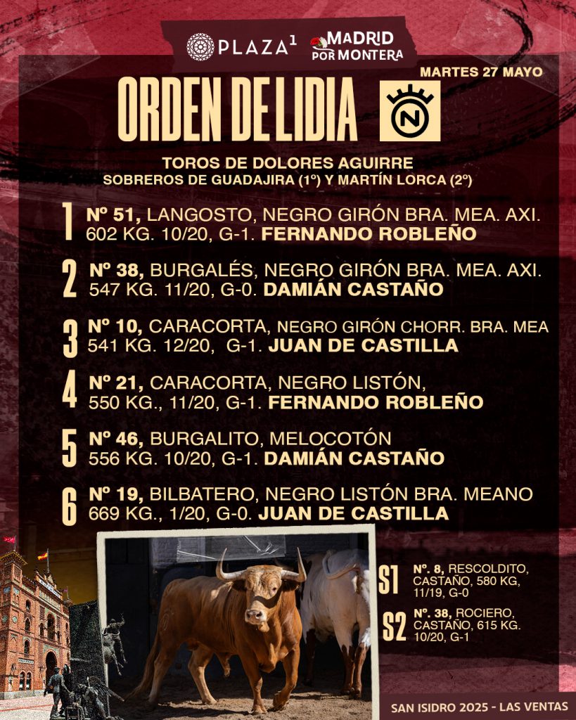 Seis toros de Dolores Aguirre aguardan ya en los chiqueros de la Plaza de Toros de Las Ventas para la decimosexta cita de la Feria de San Isidro 2025. Esta tarde, a las 19:00h., harán el paseíllo Fernando Robleño, Damián Castaño y Juan de Castilla.