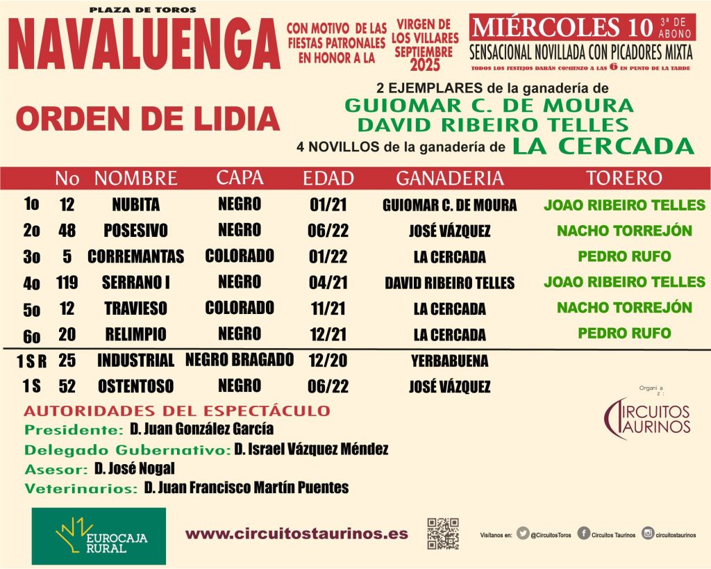 El rejoneador João Ribeiro Telles y los novilleros Nacho Torrejón y Pedro Rufo serán los encargados de su lidia. El sobrero de rejones es del hierro de Yerbabuena y el novillo de lidia a pie de José Vázquez.
