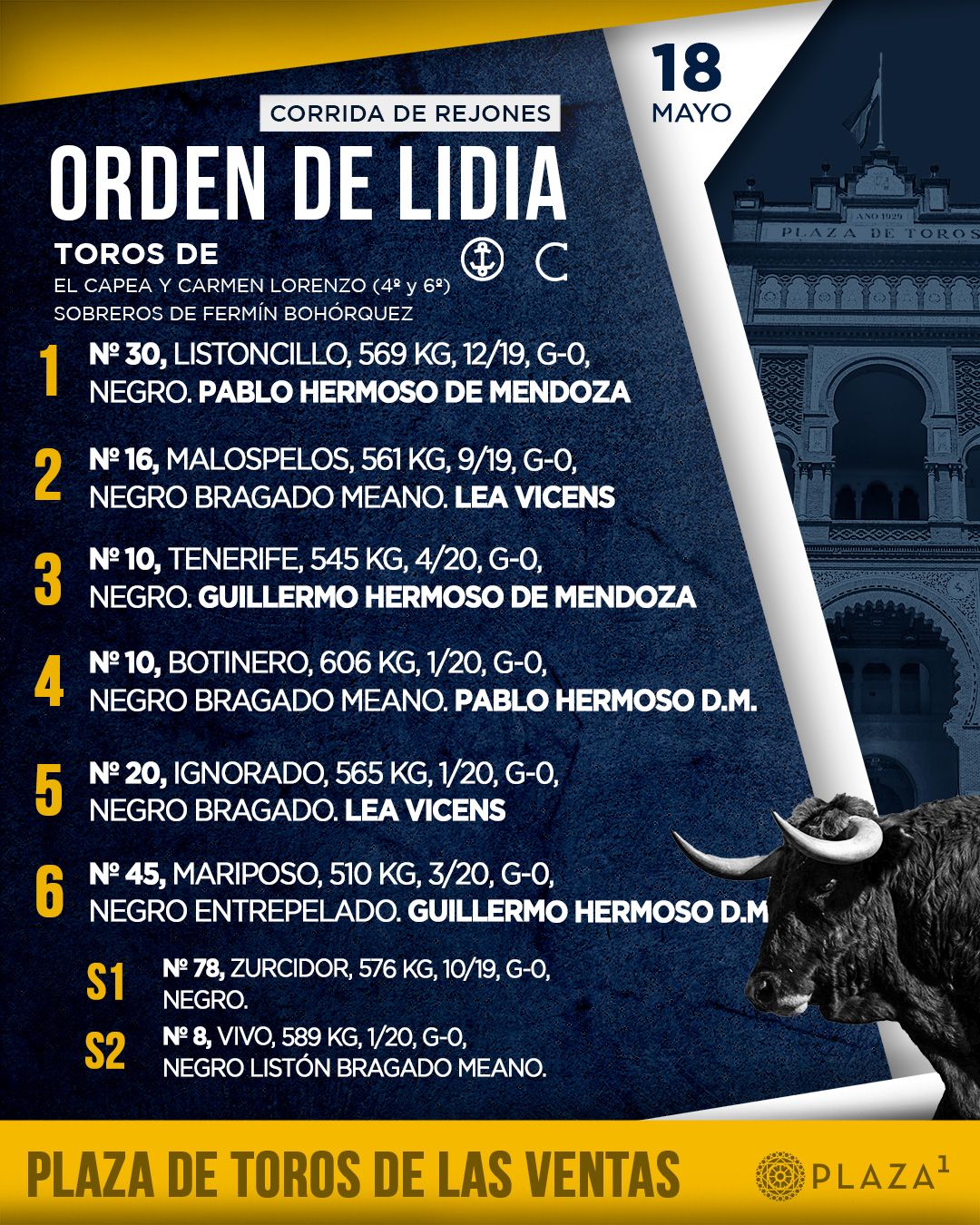 Cuatro toros de El Capea y dos de Carmen Lorenzo han sido sorteados y enchiquerados en la Plaza de Toros de Las Ventas para la primera cita de rejones de la Feria de San Isidro 2024, despedida de Pablo Hermoso de Mendoza acuartelado junto a Lea Vicens y Guillermo Hermoso de Mendoza.