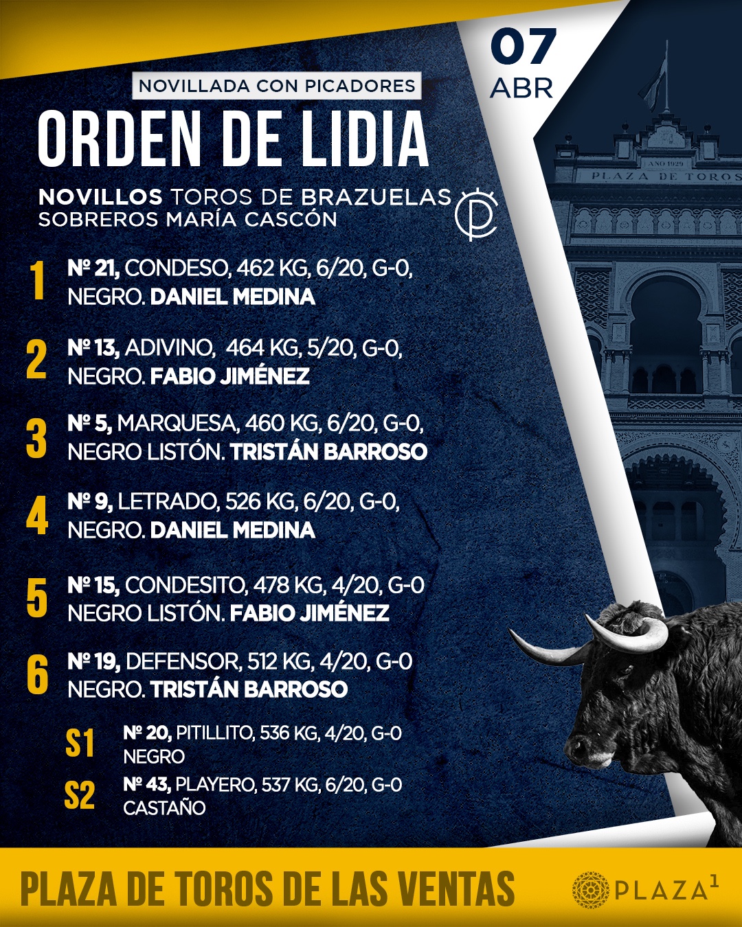 A las 18:00h. harán el paseíllo Daniel MedinaFabio Jiménez y Tristán Barroso, presentación de la terna.