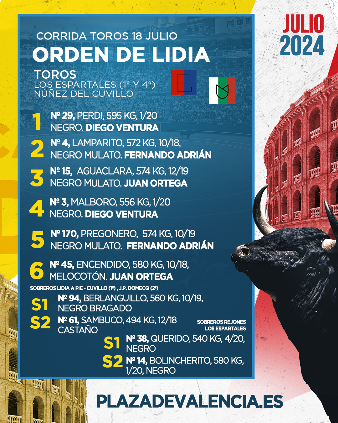 Los toros de Los Espartales para rejoneo y los de Núñez del Cuvillo para lidia a pie  han sido ya sorteados y enchiquerados en la Plaza de Toros de Valencia.