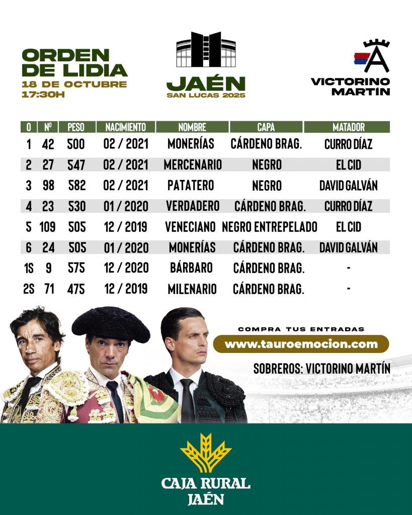 Los toros de la divisa extremeña de Victorino Martín ya han sido sorteados y enchiquerados para la segunda y última corrida de la Feria de San Lucas de Jaén.