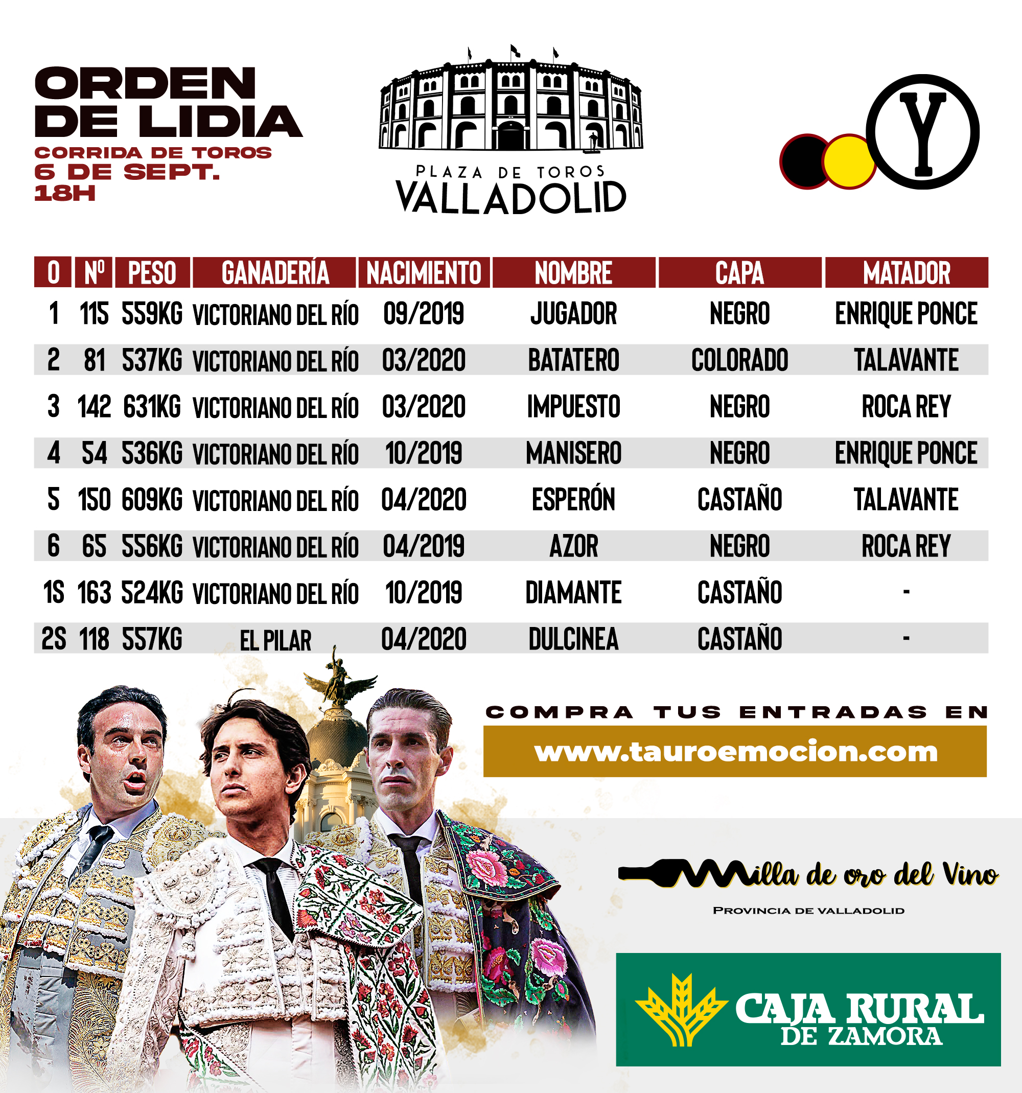 El encierro de Victoriano del Río ya ha sido enlotado y sorteado para ser lidiado esta tarde en la Plaza de Toros de ValladolidEnrique Ponce se despedirá de la afición vallisoletana, actuando junto a Alejandro Talavante y Roca Rey. El festejo comenzará a las 18 horas.