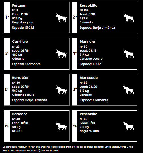 Ya han sido sorteados y enchiquerados los toros de la ganadería de Ana Romero y Joaquín Núñez del Cuvillo (2º) para la tarde de hoy en el día de San Jorge en ZARAGOZA.