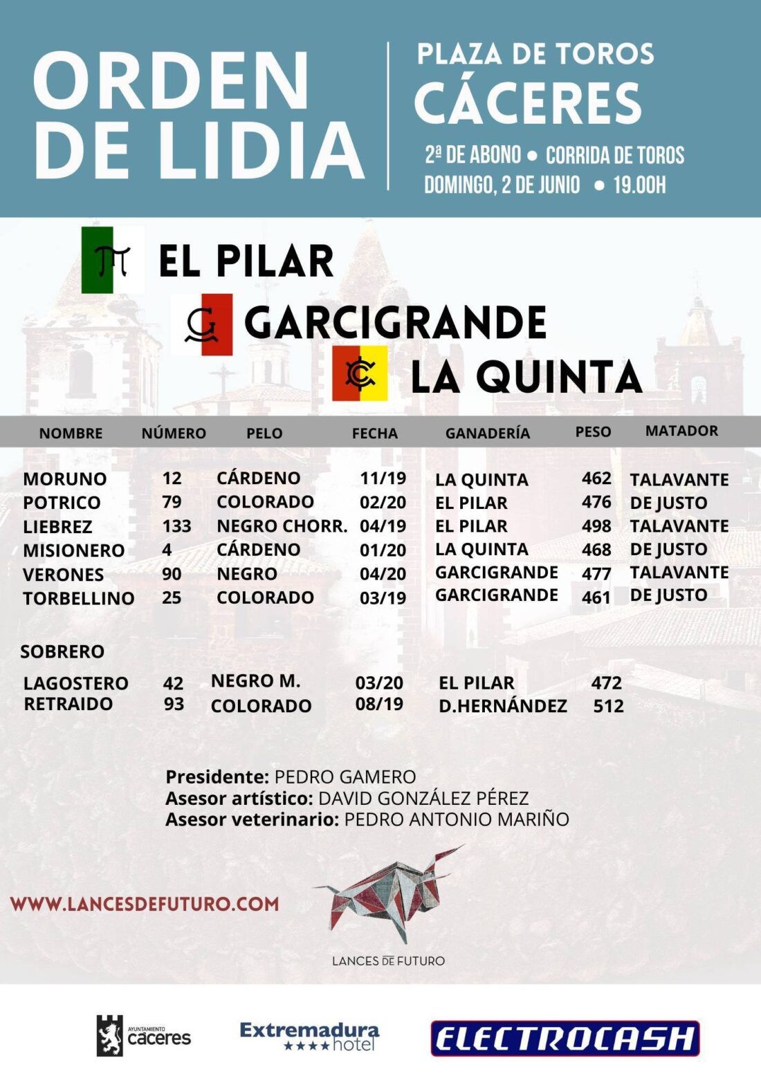 Orden de  lidia de los toros de El Pilar, La Quinta y Garcigrande para el segundo festejo de la Feria de San Fernando en Cáceres, que estoquearán Alejandro Talavante y Emilio de Justo, mano a mano
