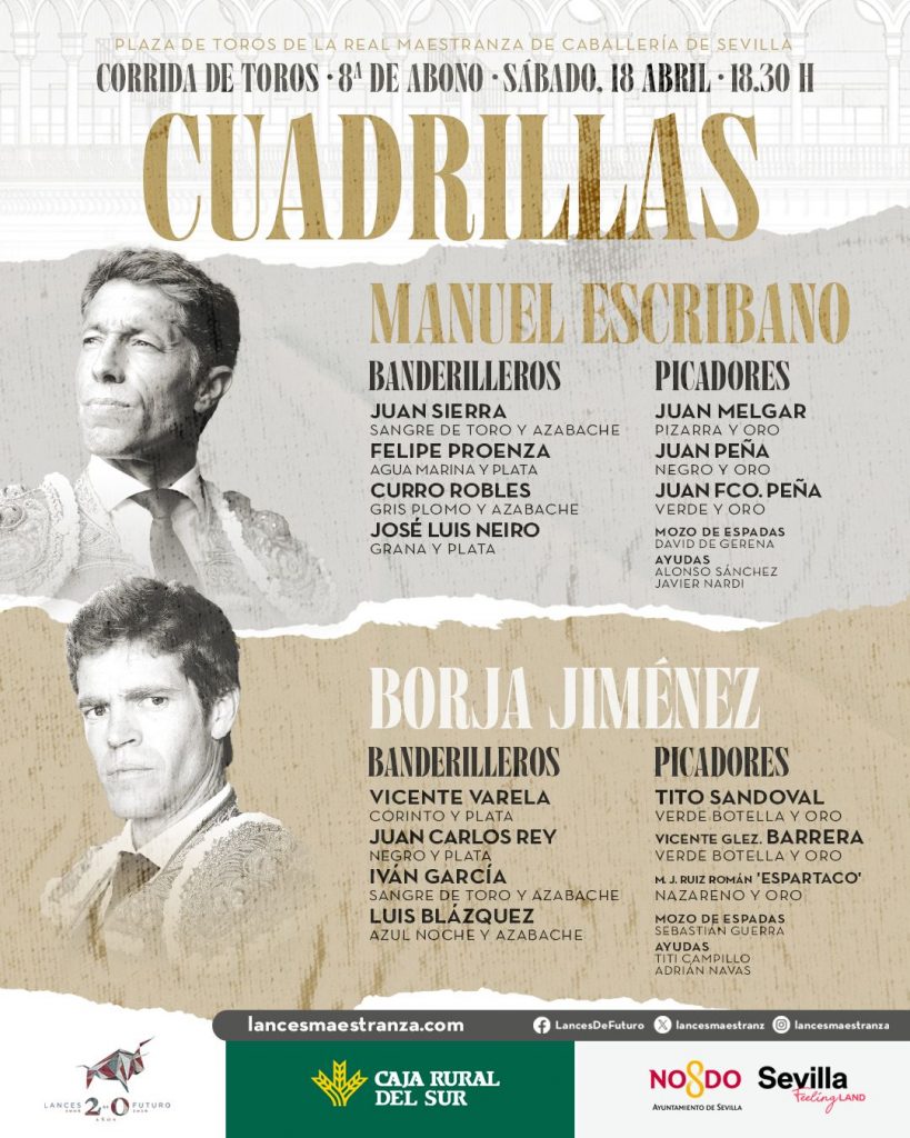 El cartel, marcado por el atractivo del hierro de la A coronada, presenta un mano a mano entre los sevillanos Manuel Escribano y Borja Jiménez, dos toreros en gran momento que se enfrentarán a uno de los encastes más exigentes del campo bravo. El festejo dará comienzo a las 18:30 horas.