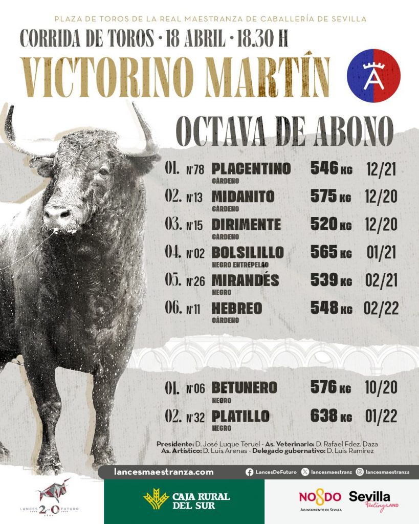 Los toros de la ganadería de Victorino Martín ya han sido sorteados y enchiquerados para el festejo que se celebrará este sábado en la Real Maestranza de Caballería de Sevilla, una de las citas más esperadas del ciclo.