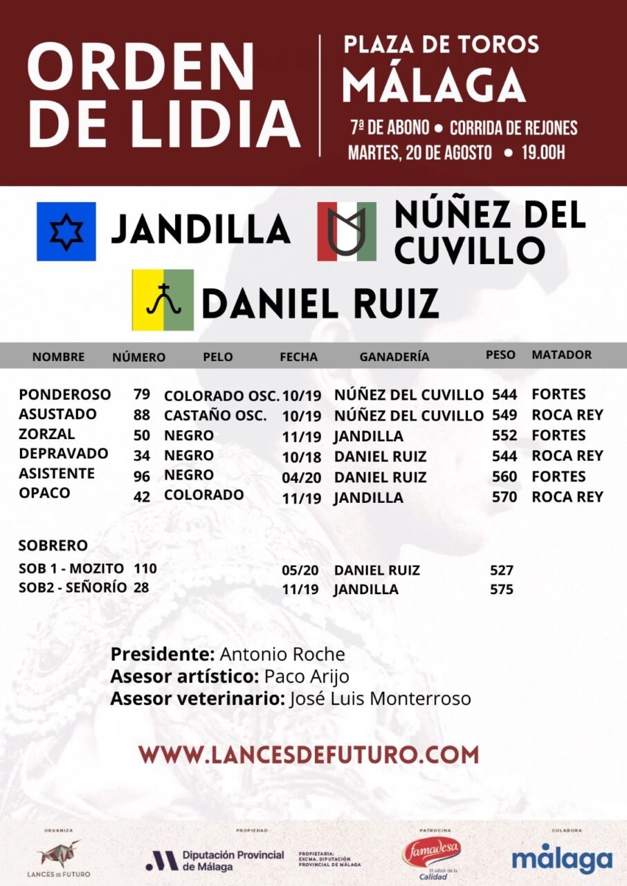 Ya han sido sorteados y enchiquerados los ejemplares de las ganaderías de Núñez del Cuvillo, Jandilla y Daniel Ruiz que se lidiarán esta tarde en la última corrida de toros de la Feria de Málaga, en la que se enfrentarán Saúl Jiménez Fortes y Andrés Roca Rey en mano a mano.