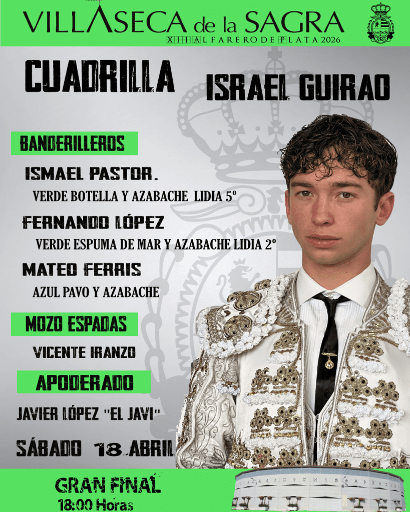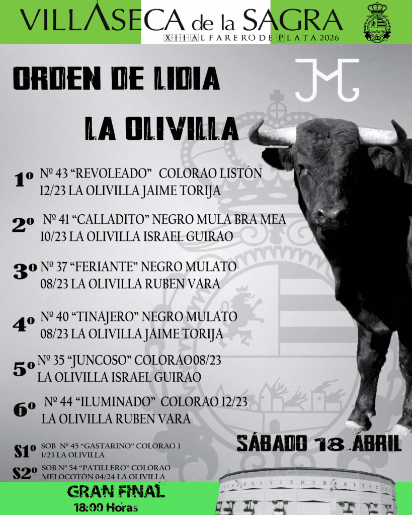Los novillos de la ganadería de La Olivilla ya han sido sorteados, embarcados y enchiquerados de cara a la gran final del XII Certamen Alfarero de Plata 2026, que medirá a Jaime Torija, Israel Guirao y Rubén Vara en la cita definitiva del ciclo.