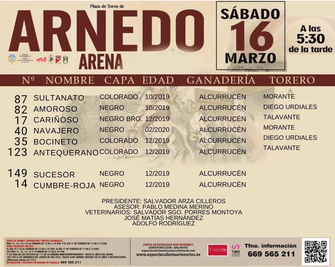 Los toros de Alcurrucén para la Feria de San José de Arnedo ya han sido sorteados y enchiquerados. En el cartel se encuentra una terna de lujo en el 25 aniversario del diestro riojano Diego Urdiales, acompañado de Morante de la Puebla y Alejandro Talavante.