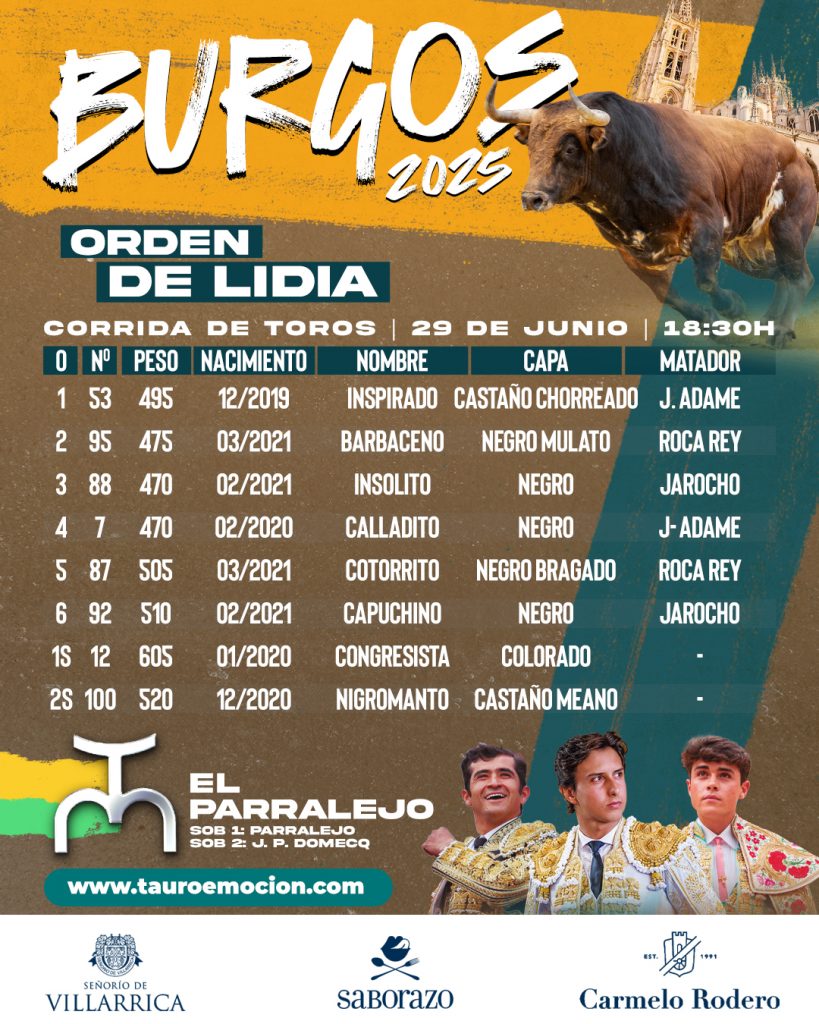 Ya han sido sorteados y enchiquerados los toros de El Parralejo que serán lidiados esta tarde en el Coliseum de Burgos por los diestros Joselito Adame, Roca Rey y Jarocho.