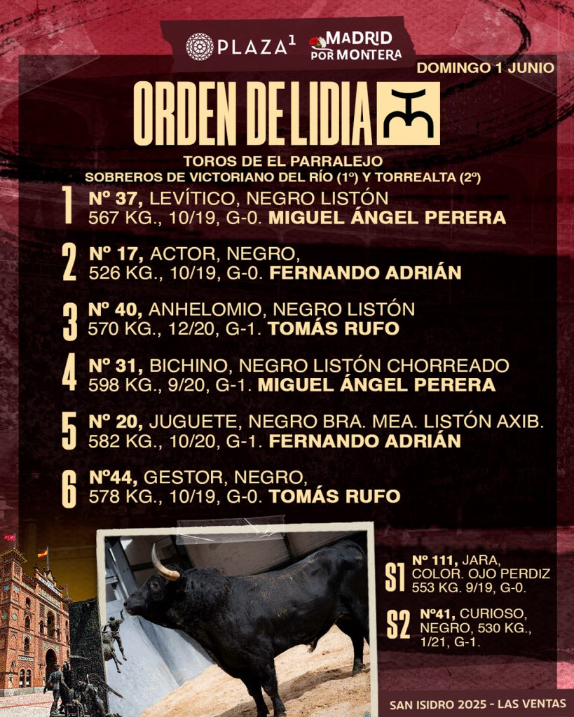 Sorteados y enchiquerados seis toros de El Parralejo para la vigésimoprimera de la Feria de San Isidro 2025, y quinto ‘No Hay Billetes’ consecutivo de la semana, decimosegundo en lo que va de feria. Esta tarde en la Plaza de Toros de Las Ventas, a las 19:00h., harán el paseíllo Miguel Ángel Perera, Fernando Adrián y Tomás Rufo.
