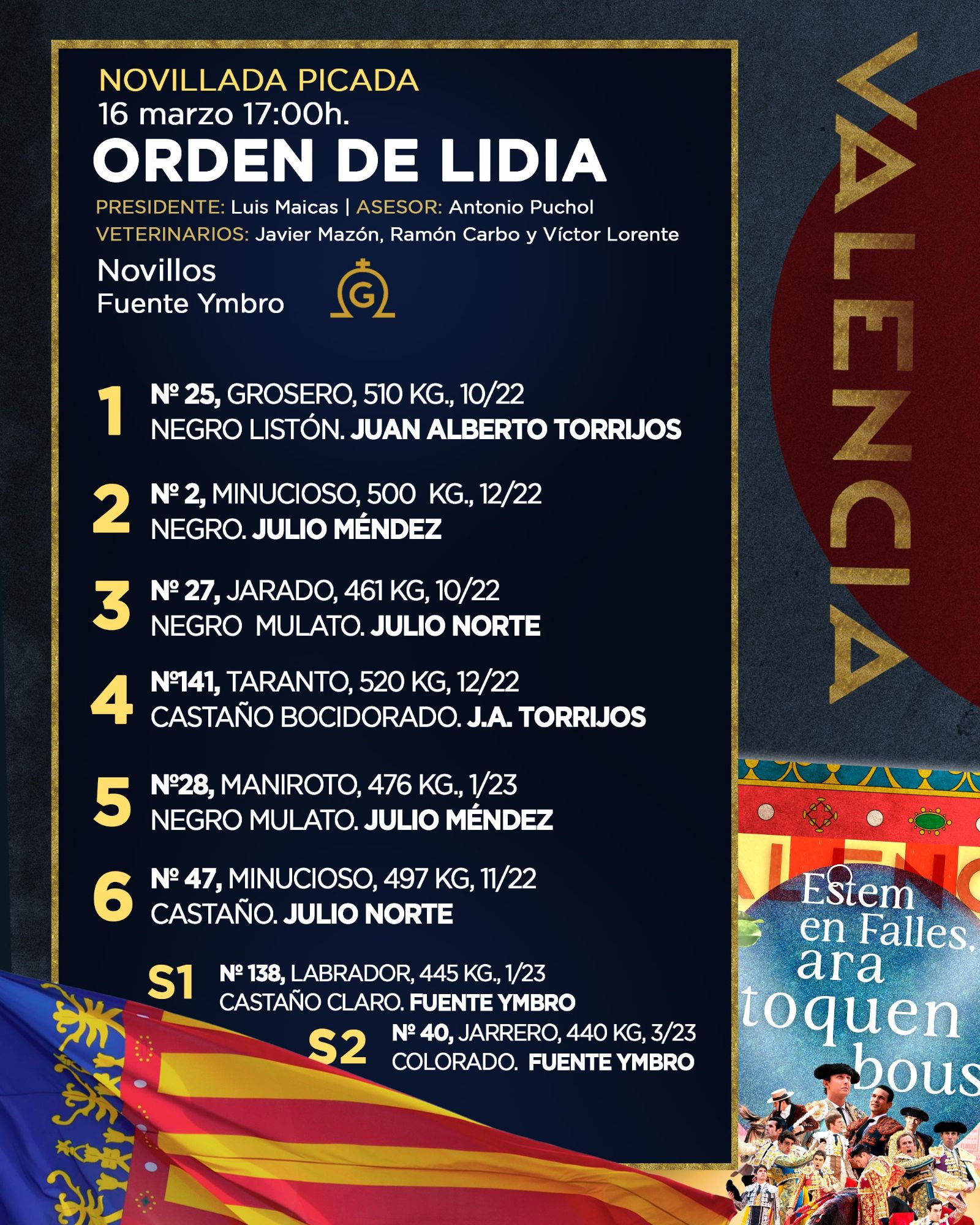 Para la ocasión se lidiará un encierro compuesto por seis novillos de la ganadería de Fuente Ymbro, uno de los hierros habituales en este tipo de citas del calendario valenciano.