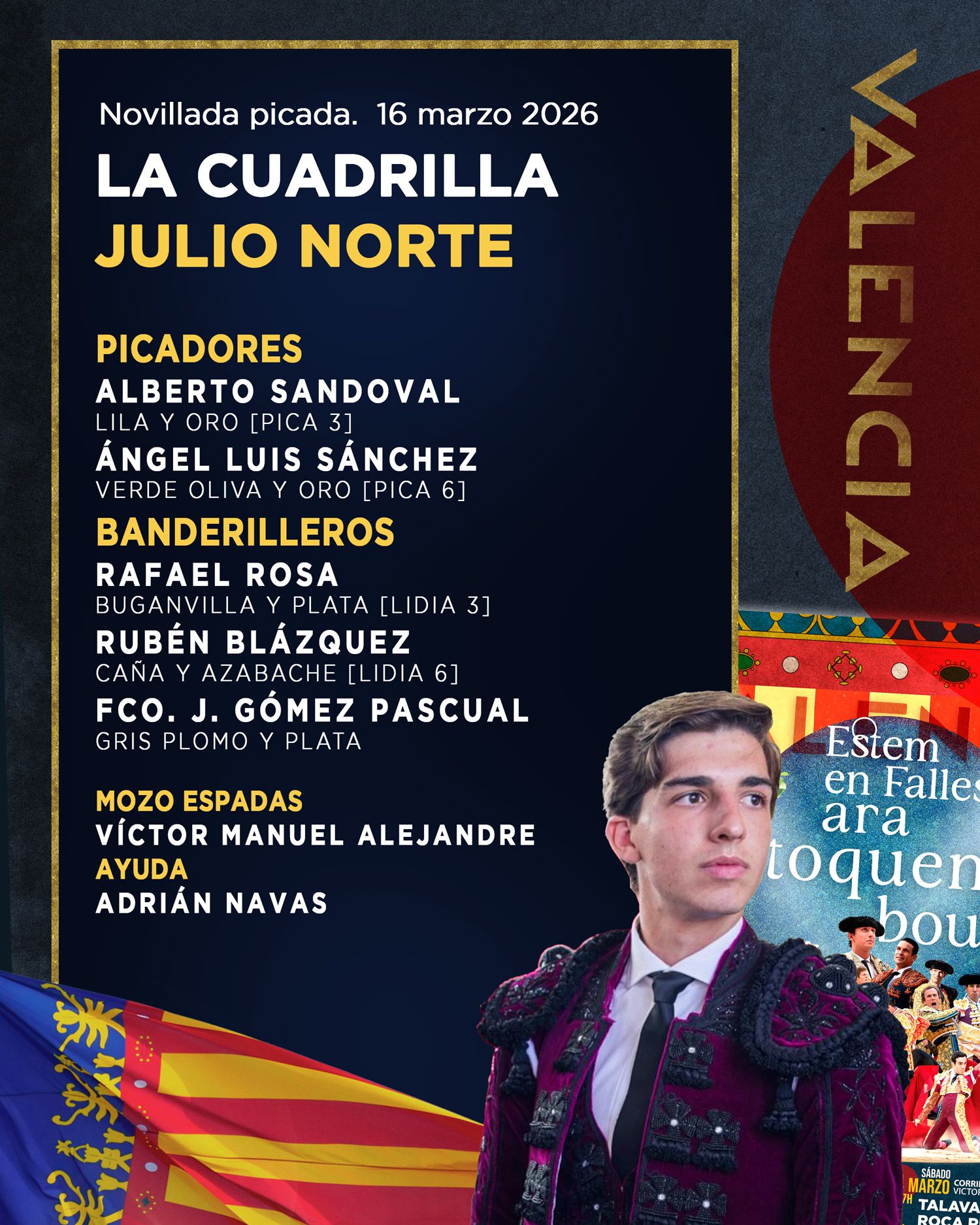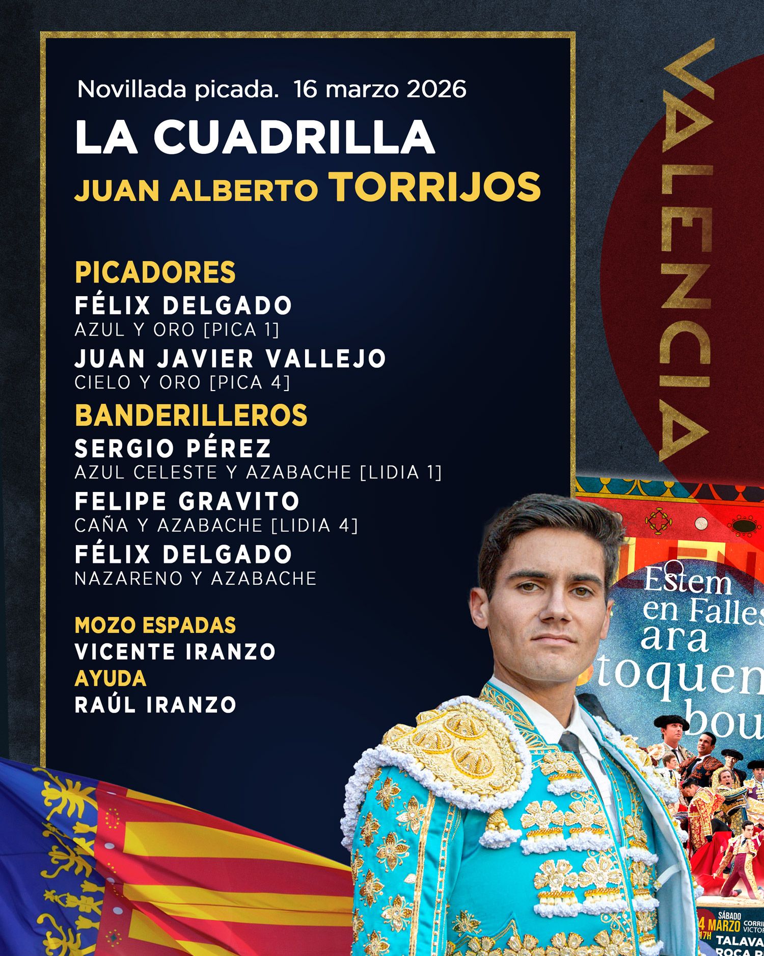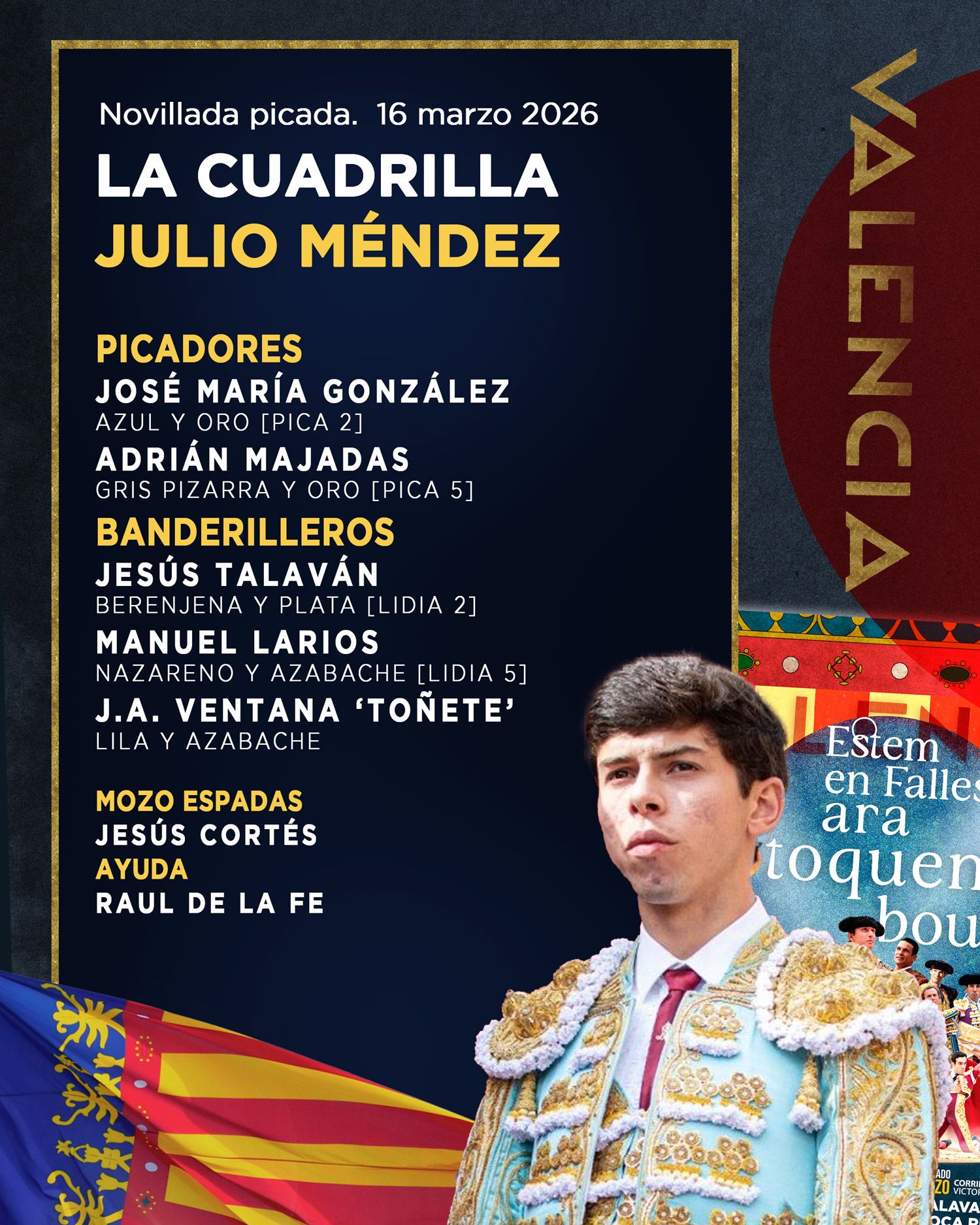 A partir de las 17:00 horas harán el paseíllo los novilleros Juan Alberto Torrijos, Julio Méndez y Julio Norte, quienes tendrán la responsabilidad de cerrar el ciclo de tres novilladas programadas dentro del abono fallero.