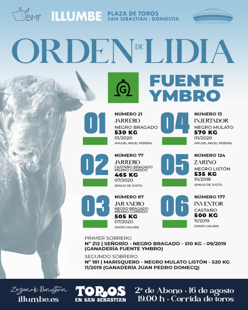 Los toros de Fuente Ymbro para el segundo festejo de la San Sebastián ya han sido sorteados y enchiquerados. A los astados de la divisa gaditana se enfrentará una terna formada por Miguel Ángel Perera, Emilio de Justo David Galván. El festejo comenzará a las 18 horas.