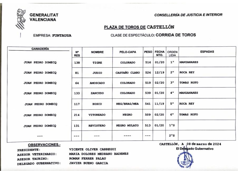 Los toros de Juan Pedro Domecq,  serán lidiados en la cuarta de la Feria de la Magdalena de Castellón, ya han sido sorteados. En el cartel están anunciados Manzanares, Roca Rey y Tomás Rufo.