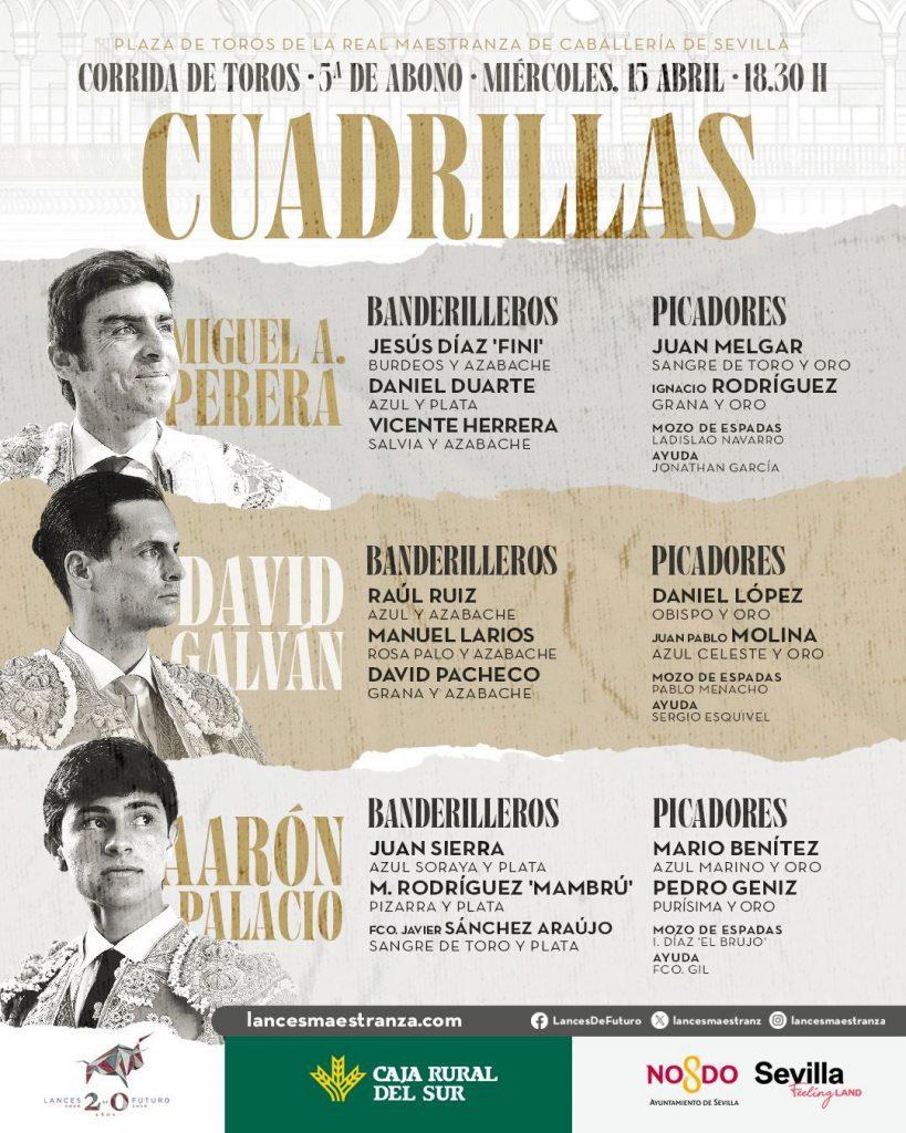 Harán el paseíllo los diestros Miguel Ángel Perera, David Galván y Aarón Palacio, en una terna que combina experiencia y proyección ante un encierro de interés.