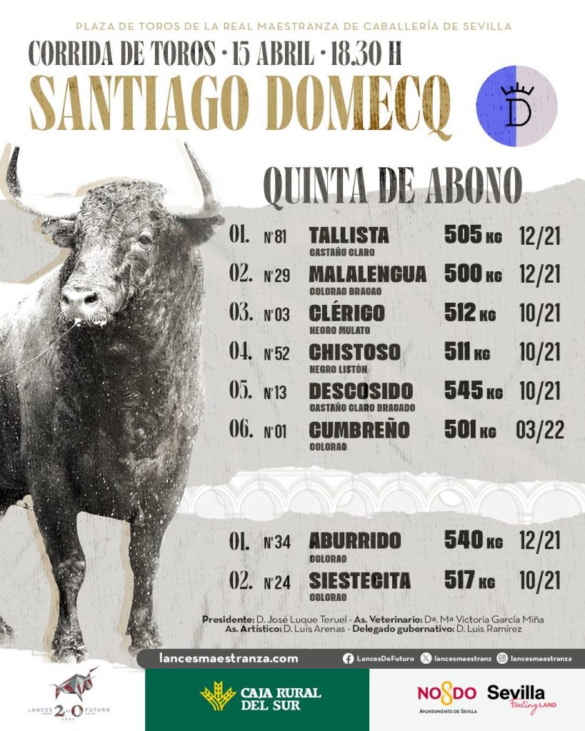 Ya han sido sorteados y enchiquerados los toros de Santiago Domecq que se lidiarán esta tarde en el cuarto festejo de la Feria de Abril de Sevilla, una cita que mantiene el pulso del abono en el coso maestrante.