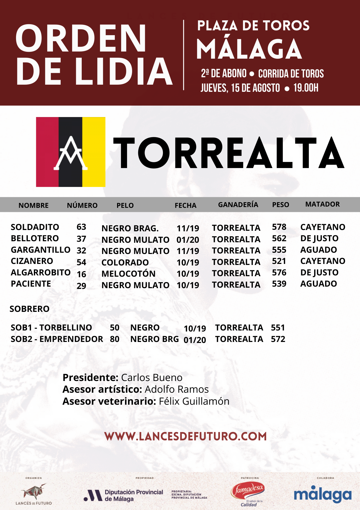 Listos los toros de Torrealta para la Corrida Picassiana de esta tarde en Málaga. Un festejo que comenzará a las 19 horas y en el que harán el paseíllo Cayetano, Emilio de Justo y Pablo Aguado. Los sobreros pertenecen a la ganadería titular.