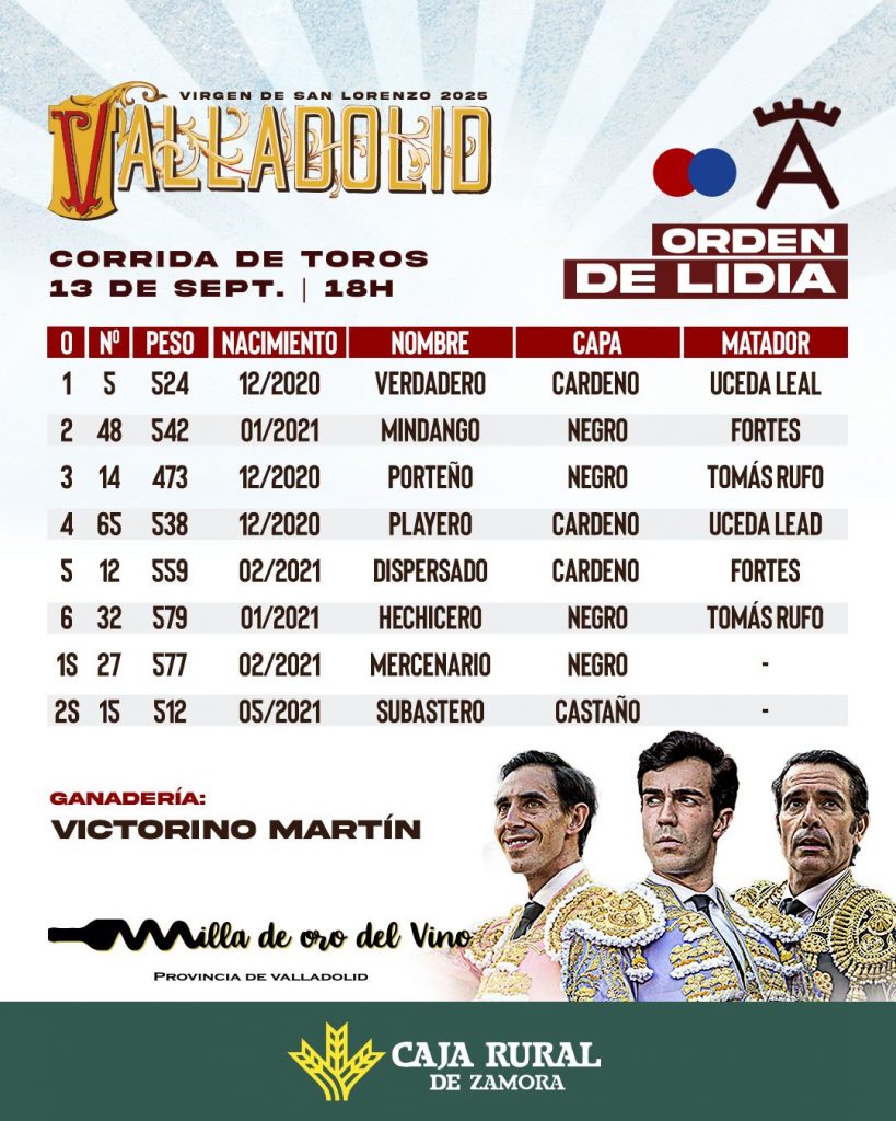 Los toros de Victorino Martín han sido sorteados y enchiquerados para la cita de esta tarde en la plaza de Valladolid.