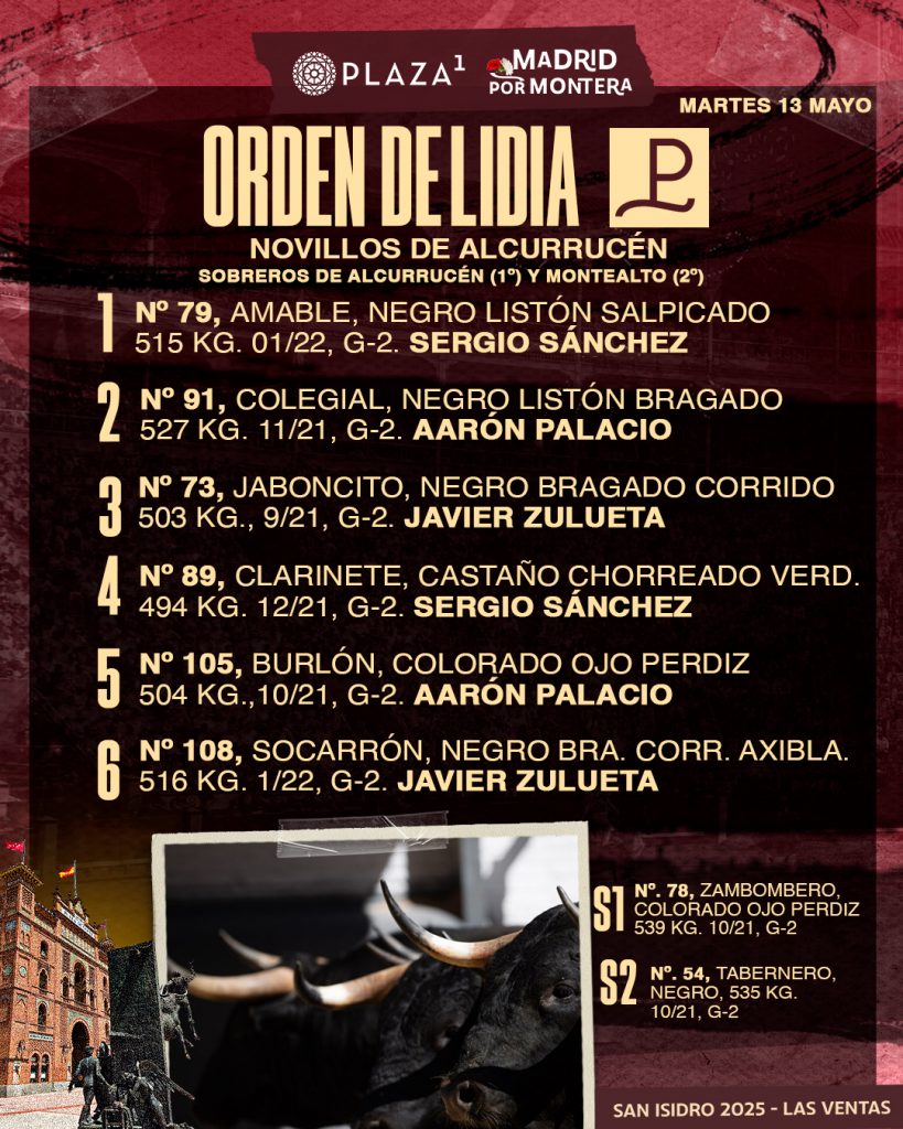 Sorteados y enchiquerados seis novillos de Alcurrucén para la primera novillada del ciclo, cuarto festejo de la Feria de San Isidro 2025. A las 19h. en la Plaza de Toros de Las Ventas harán el paseíllo Sergio SánchezAarón Palacio Javier Zulueta, presentación de la terna.