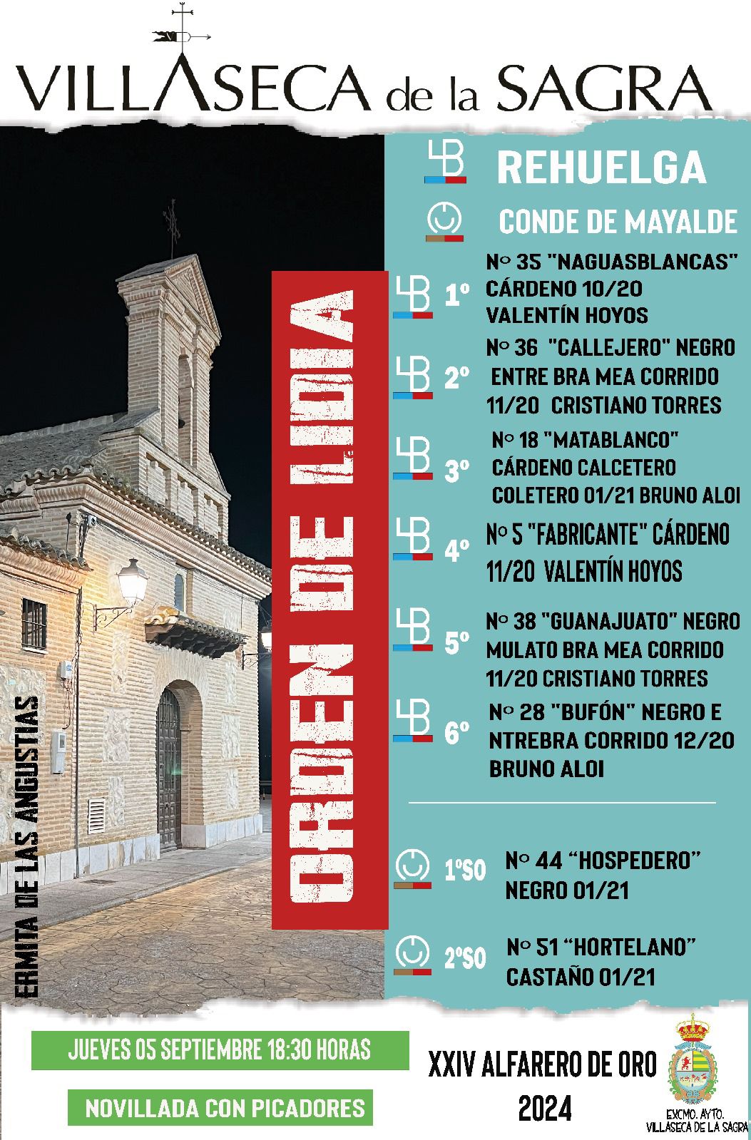 Los ejemplares de la divisa de Rehuelga ya han sido sorteados y enchiquerados, a la espera de ser lidiados esta tarde en la segunda novillada del ‘Alfarero de Oro’ de Villaseca de la Sagra. Los novillero encargados de estoquearla esta tarde serán Valentín Hoyos, Cristiano Torres y Bruno Aloi.