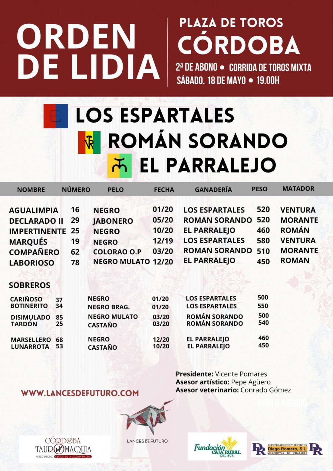 Seis toros de las ganaderías de Los Espartales, Román Sorando, y El Parralejo han sido enchiquerados para la corrida mixta que se celebrará esta tarde en la plaza de toros de Córdoba.