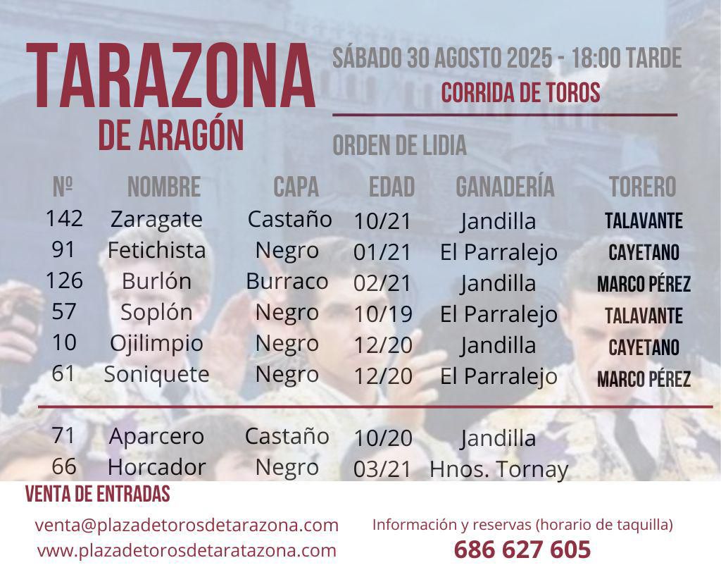 Ya están sorteados y enchiquerados los toros de Jandilla (1º, 3º y 5º) y El Parralejo (2º, 4º y 6º) que se lidiarán esta tarde en la última corrida de la feria de Tarazona. En el cartel figuran Cayetano, Alejandro Talavante y Marco Pérez. El festejo comenzará a las 18:00 horas.