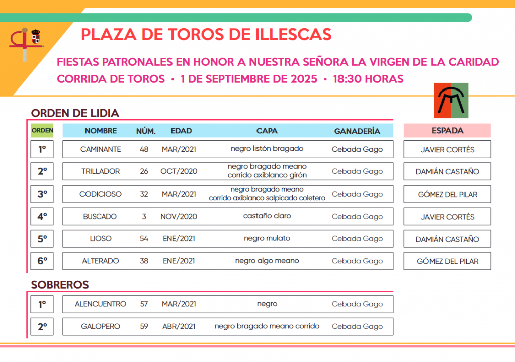 Los toros de Cebada Gago ya han sido sorteados y enchiquerados para la corrida que se celebrará este lunes en la plaza toledana de Illescas. En el cartel figuran Javier Cortés, que sustituye a Juan de Castilla, Damián Castaño y Gómez del Pilar. El paseíllo está previsto para las 18:30 horas.
