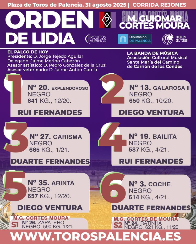 Seis toros de María Guiomar Cortés de Moura aguardan ya en la plaza de toros de Palencia para la segunda cita de San Antolín 2025. A las 18:00h. los lidiarán Rui Fernandes, Diego Ventura y Duarte Fernandes.