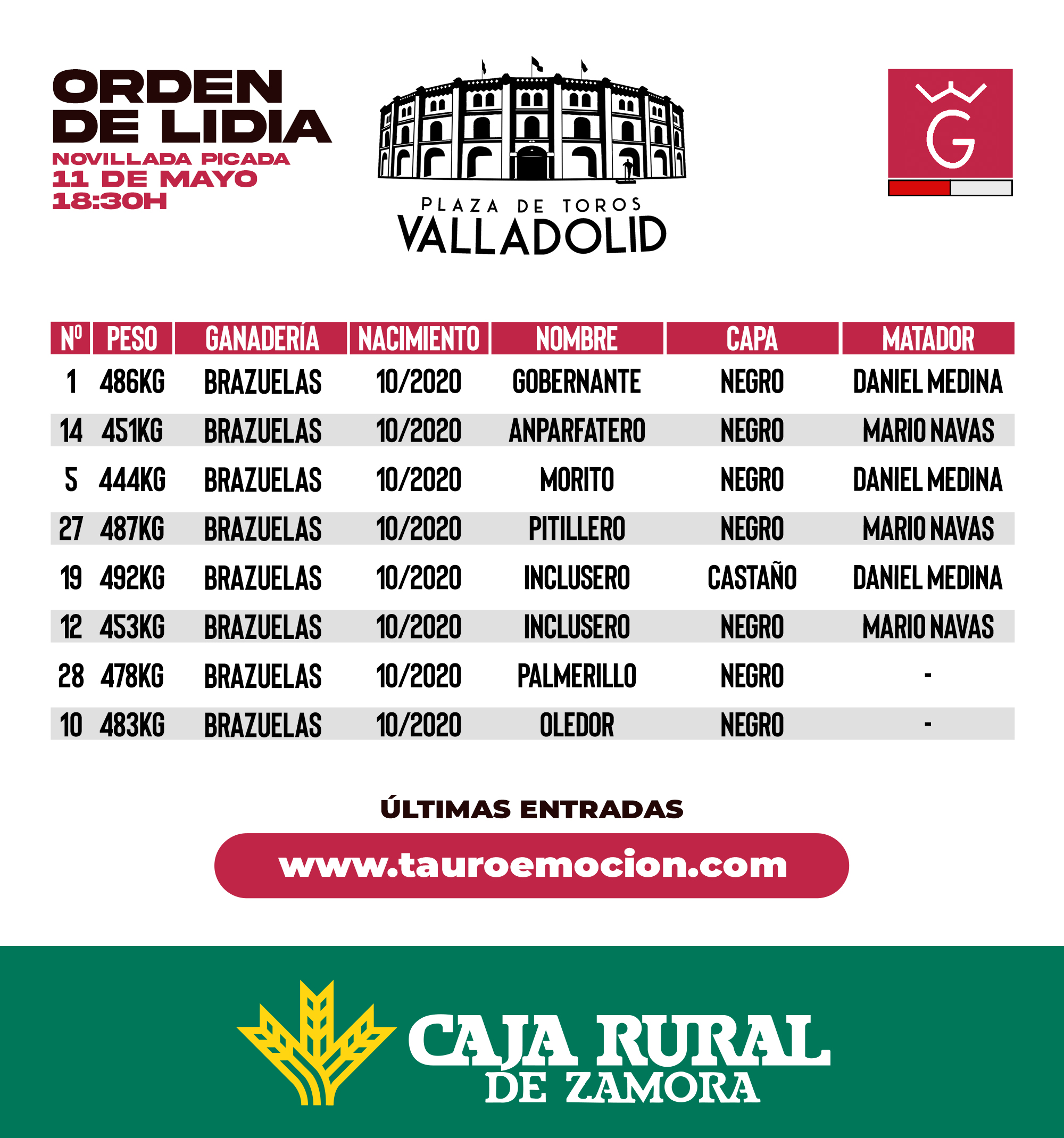 Ya han sido sorteados y enchiquerados los novillos de la ganadería vallisoletana de Toros de Brazuelas para el mano a mano entre Daniel Medina y Mario Navas que abre la Feria de San Pedro Regalado en Valladolid. El festejo comenzará a partir de las 18:30