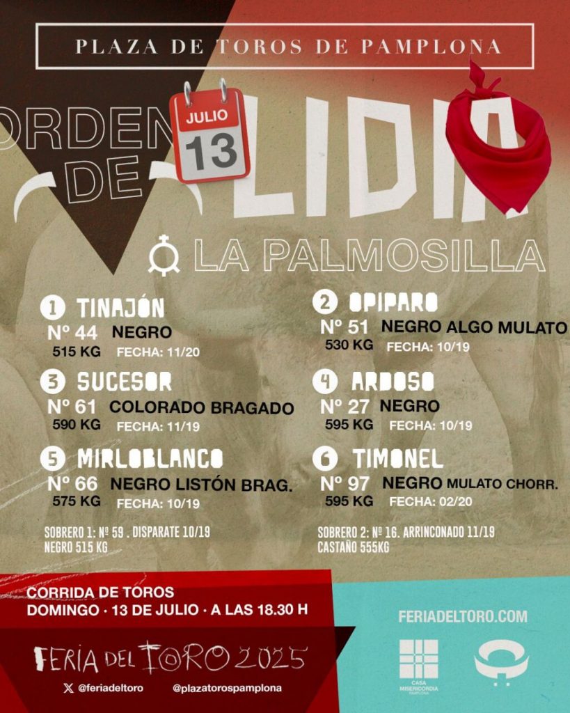 Ya han sido sorteados y enchiquerados los toros de La Palmosilla que se lidiarán esta tarde en la penúltima corrida de la Feria del Toro de Pamplona. El encierro gaditano regresa a la Monumental de la capital navarra con una corrida que será estoqueada por una terna compuesta por Fortes, Fernando Adrián y Ginés Marín.