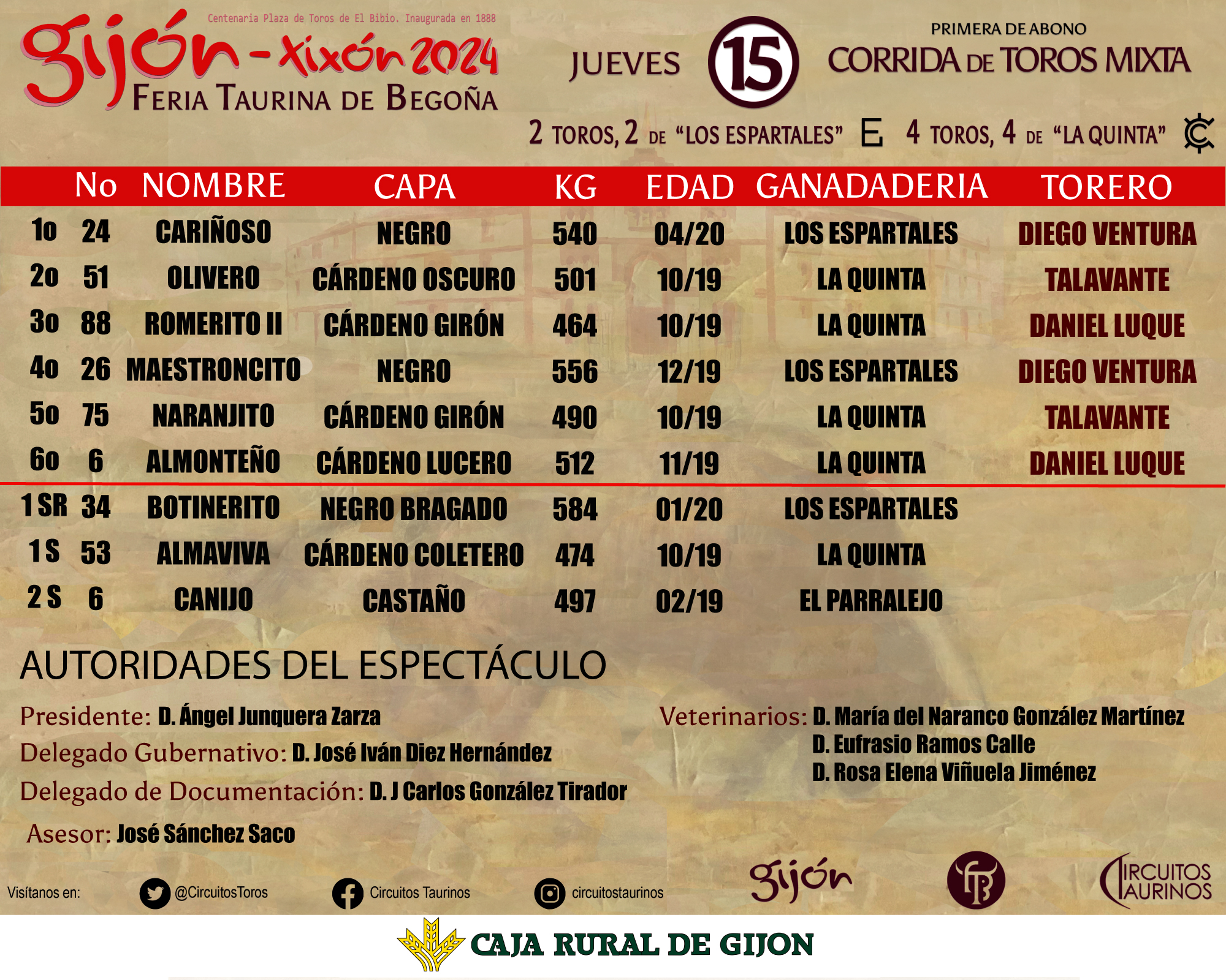 El sobrero de rejones pertenece, como los titulares, a la divisa de Los Espartales, mientras que los de lidia a pie son de las ganaderías de La Quinta y El Parralejo.