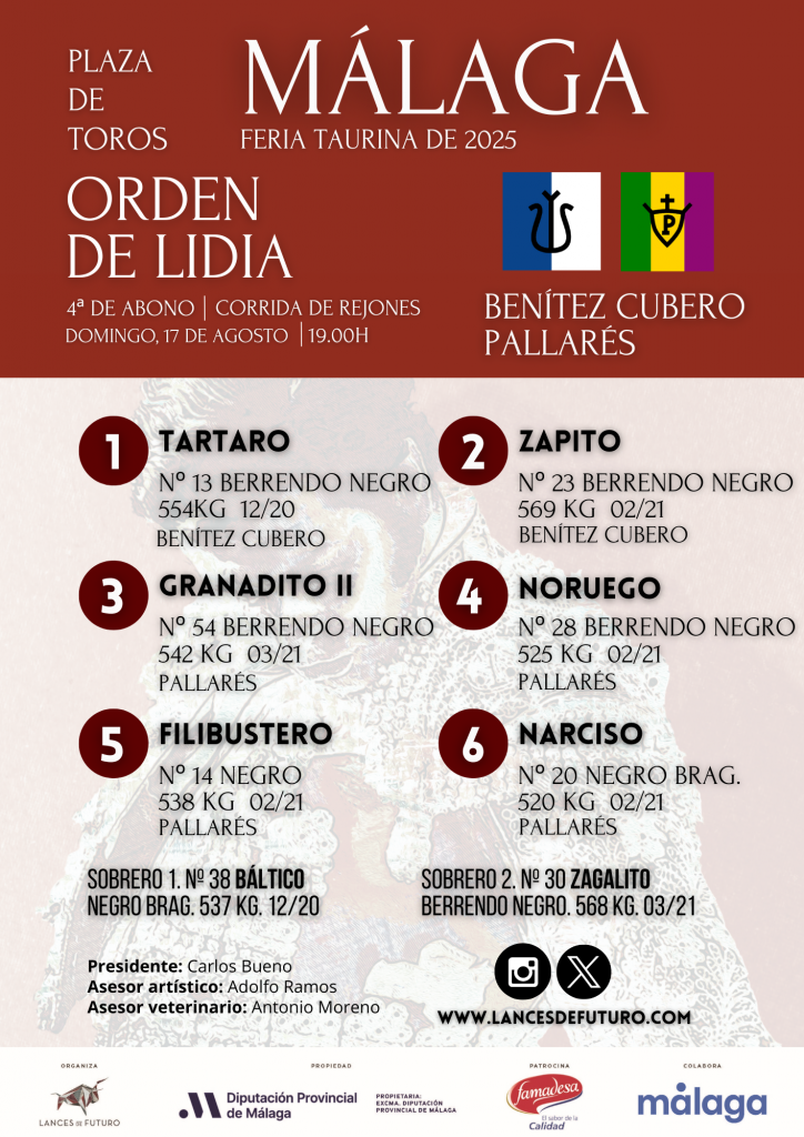 Ya han sido sorteados y enchiquerados los seis toros de Benítez Cubero y Pallarés que esta tarde se lidiarán en la plaza de toros de Málaga. El encierro será lidiado por los rejoneadores Sergio Galán, Diego Ventura y Ferrer Martín a partir de las 19:00.