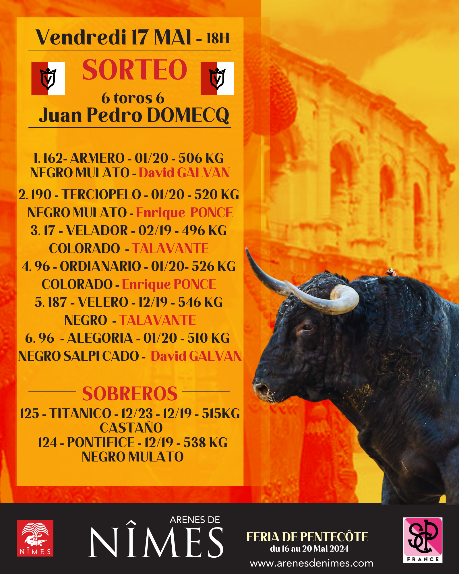 Seis toros de Juan Pedro Domecq han sido sorteados y enchiquerados en Nîmes para uno de los carteles estrella de la Feria de Pentecostés.