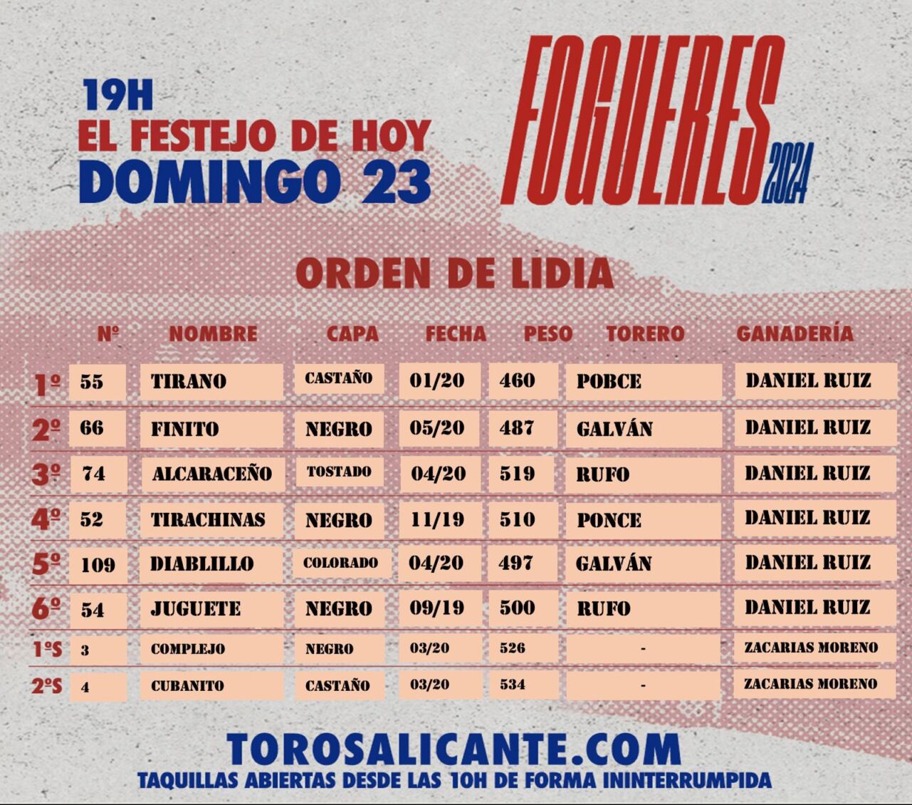 Los toros de Daniel Ruiz, serán lidiados en el penúltimo festejo de la Feria de Hogueras de Alicante 2024, ya han sido sorteados. En el cartel se anuncia Enrique Ponce, que se despedirá del coso alicantino, David Galván y Tomás Rufo. El festejo comienza a las 19:00 horas.