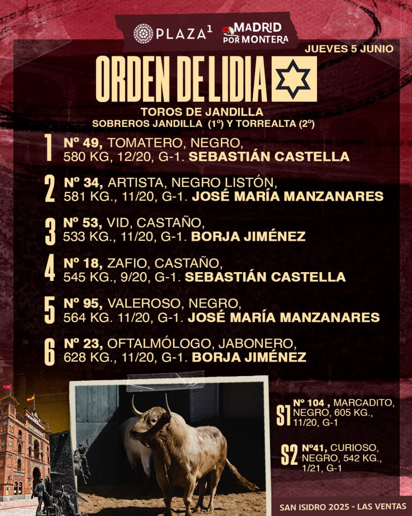 Sorteados y enchiquerados seis toros de Jandilla para la vigesimocuarta de la Feria de San Isidro 2025, cita en la que se va a colgar el decimotercer ‘No Hay Billetes’ del serial isidril. Esta tarde en la Plaza de Toros de Las Ventas, a las 19:00h., harán el paseíllo Sebastián CastellaManzanares y Borja Jiménez.