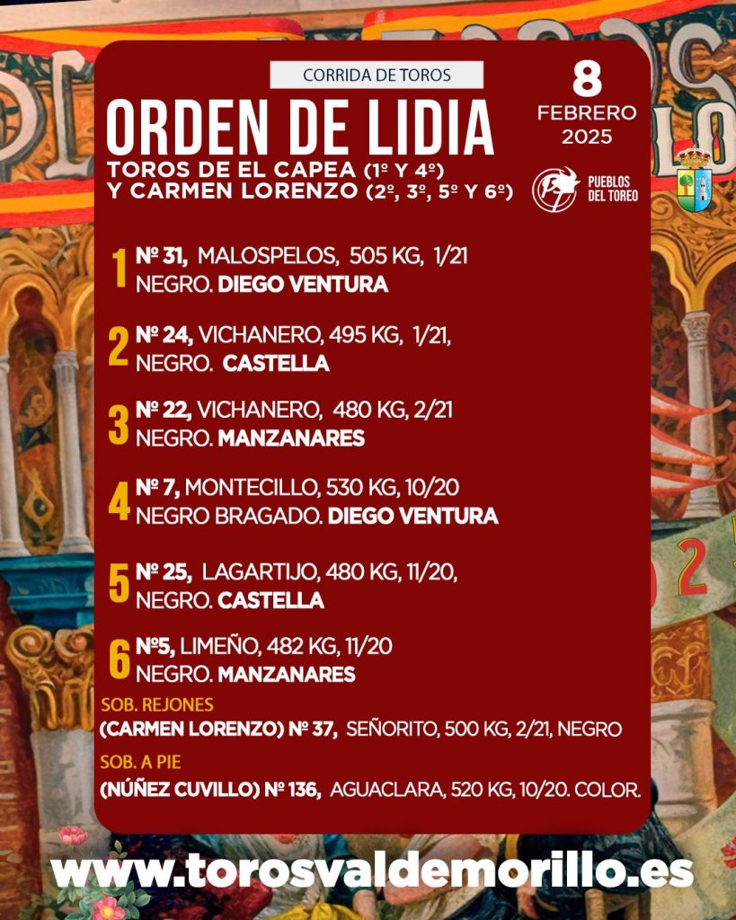 La Plaza de Toros de Valdemorillo ya tiene listos los seis toros de El Capea y Carmen Lorenzo para la segunda cita de la Feria de San Blas y La Candelaria, que se celebrará este sábado. La expectación es máxima ante un cartel de gran atractivo, en el que Diego Ventura, Sebastián Castella y José María Manzanares trenzarán el paseíllo a las 17h.