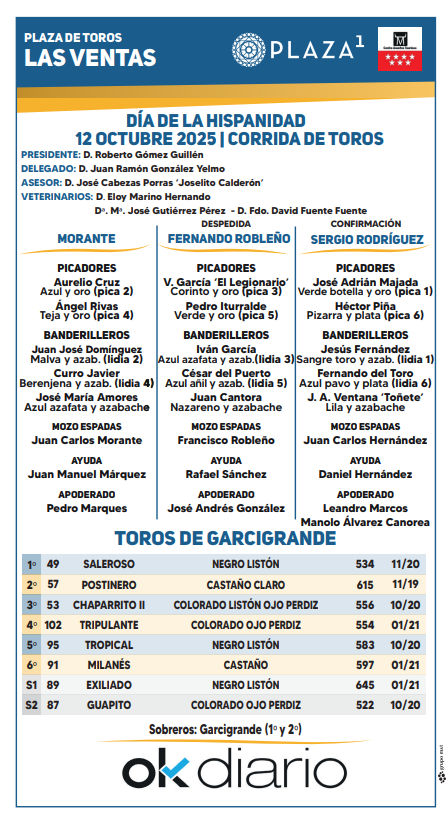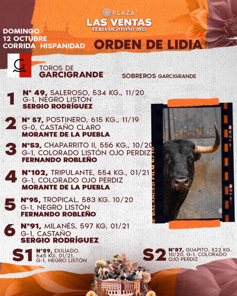 Seis toros de la divisa de Garcigrande aguardan ya en los corrales de la Plaza de Toros de Las Ventas para la cita del Día de la Hispanidad. Esta tarde, a las 18h., serán lidiados por Morante de la Puebla, Fernando Robleño, que se despide, y Sergio Rodríguez, que confirma alternativa.
