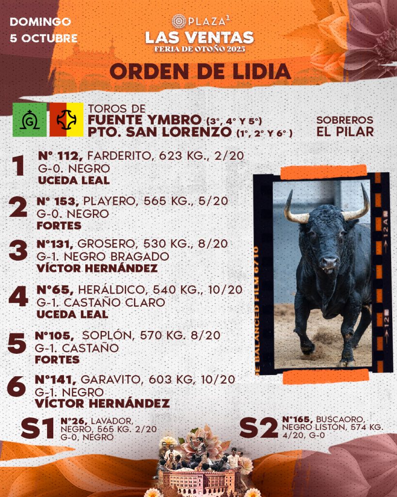 Ya han sido sorteados y enchiquerdos tres toros de Puerto de San Lorenzo (1º, 2º y 6º) y tres de Fuente Ymbro (3º, 4º y 5º) para la cuarta cita de la Feria de Otoño. Esta tarde, en la Plaza de Toros de Las Ventas, a las 18h. harán el paseíllo Uceda LealFortes Víctor Hernández.