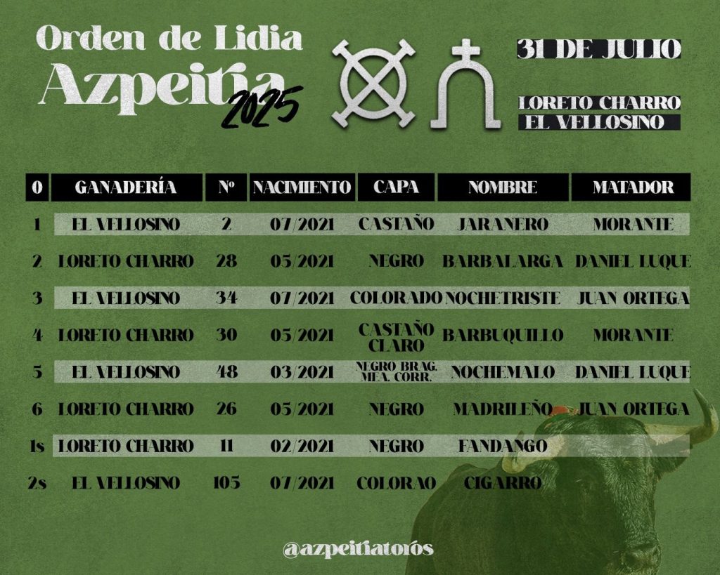 Están sorteados y enchiquerados seis toros del campo de Salamanca: Tres de Loreto Charro, ganadería que tan buen juego dio en 2024 en esta plaza, y tres de Vellosino, divisa debutante en Azpeitia.