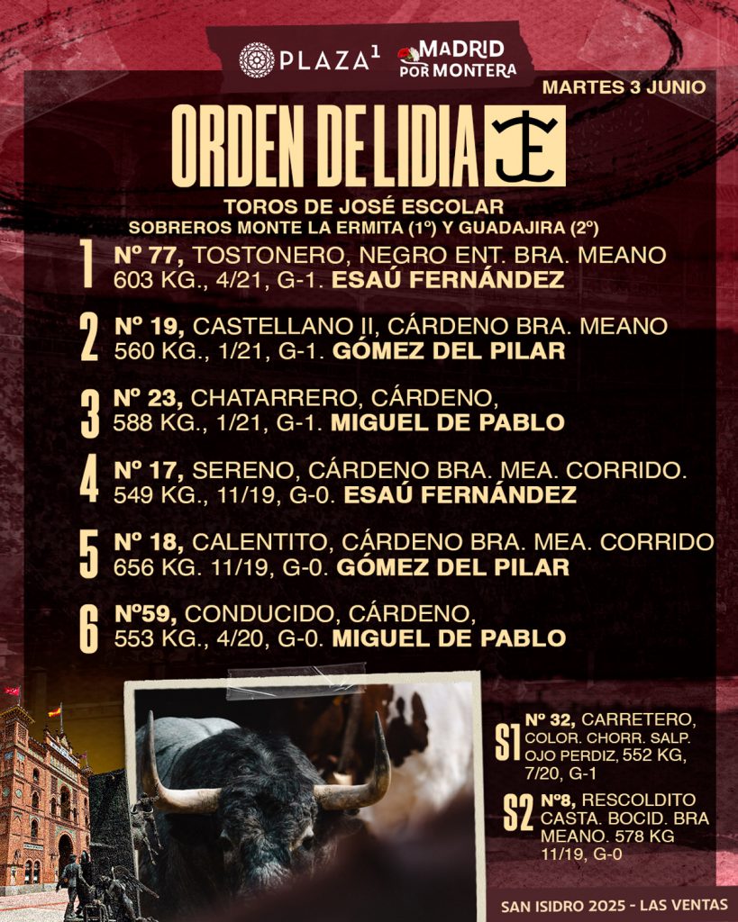 Aguardan ya en los corrales de la Plaza de Toros de Las Ventas seis toros de José Escolar para la vigesimosegunda de la Feria de San Isidro 2025. Esta tarde, a las 19:00h., harán el paseíllo Esaú Fernández, Gómez del Pilar y Miguel de Pablo.