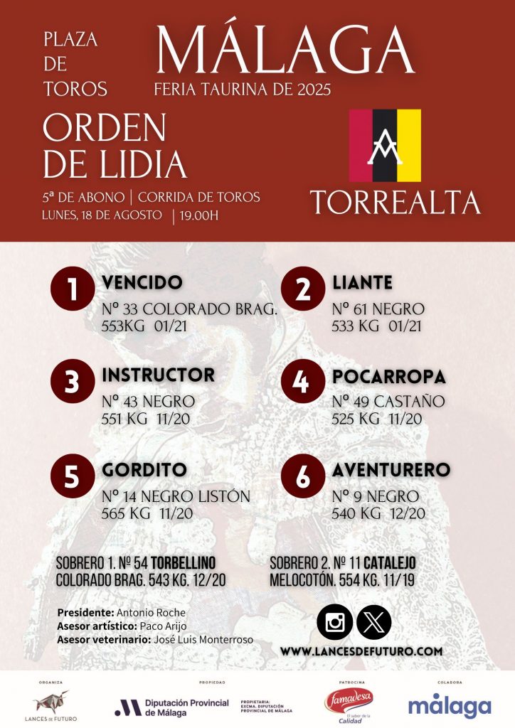 La Feria Taurina de Málaga 2025 entra en su tramo de figuras este lunes 18 de agosto con un auténtico cartelazo. Los toros de la divisa de Torrealta, ya enlotados y sorteados, serán los protagonistas de una tarde en la que harán el paseíllo Diego Urdiales —en sustitución de Morante de la Puebla—, Fortes y Pablo Aguado.