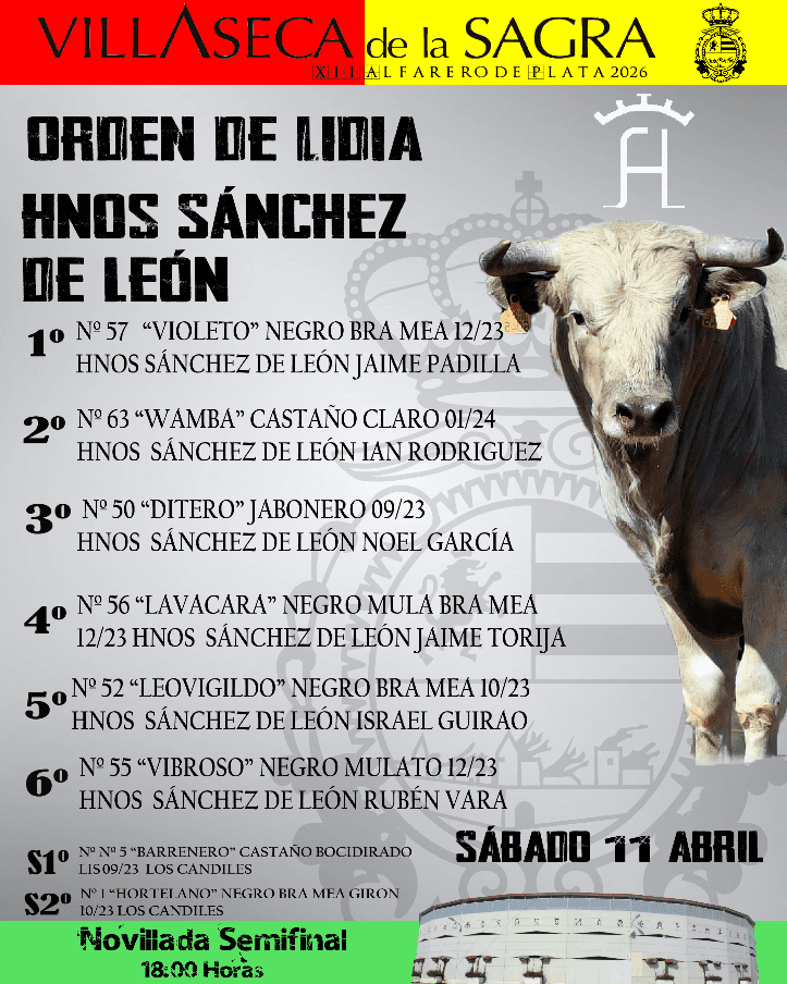 La plaza de toros de Villaseca de la Sagra será escenario este sábado de una de las citas clave del XII Alfarero de Plata, con la disputa de su semifinal, ya con los erales de Hermanos Sánchez de León sorteados y preparados para la lidia.